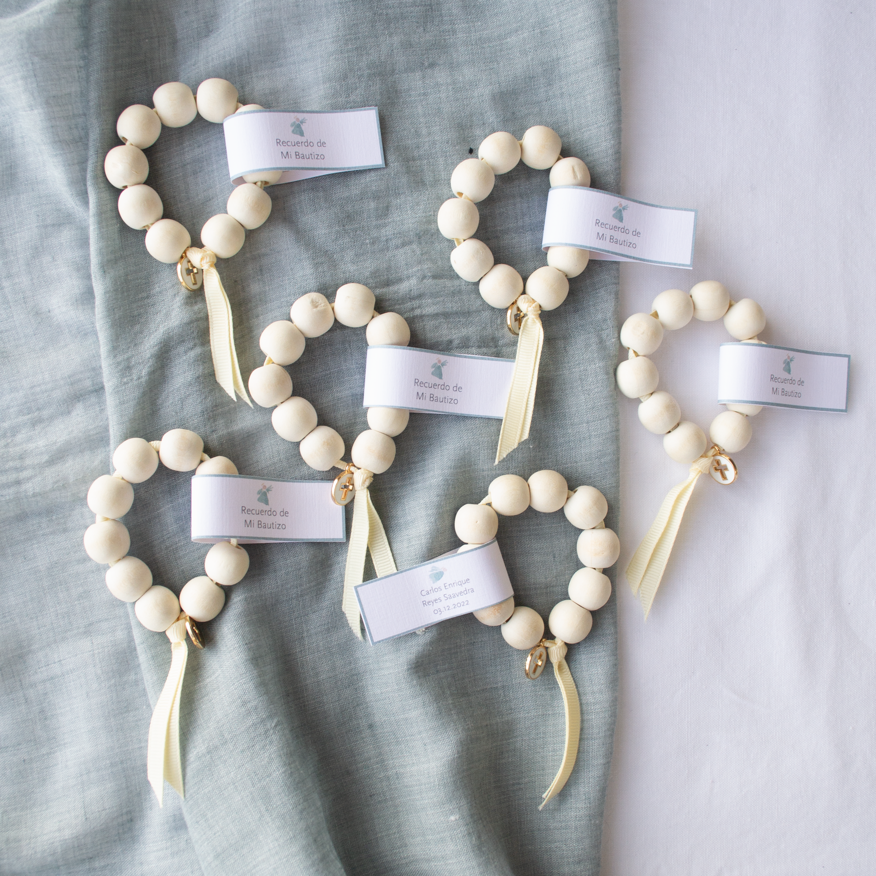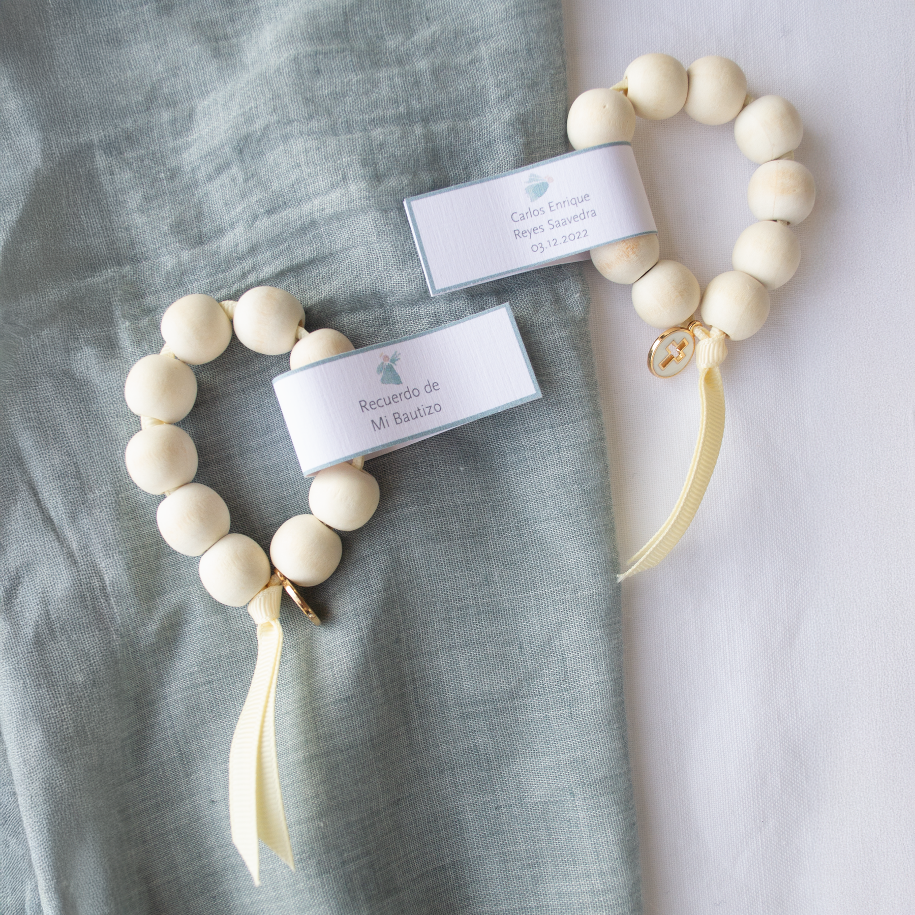 Cada uno de estos denarios de mandera viene con una tarjeta personalizada que indica qué tipo de celebración es (bautizo, primera comunión, etc), la fecha del evento y el nombre del celebrado.