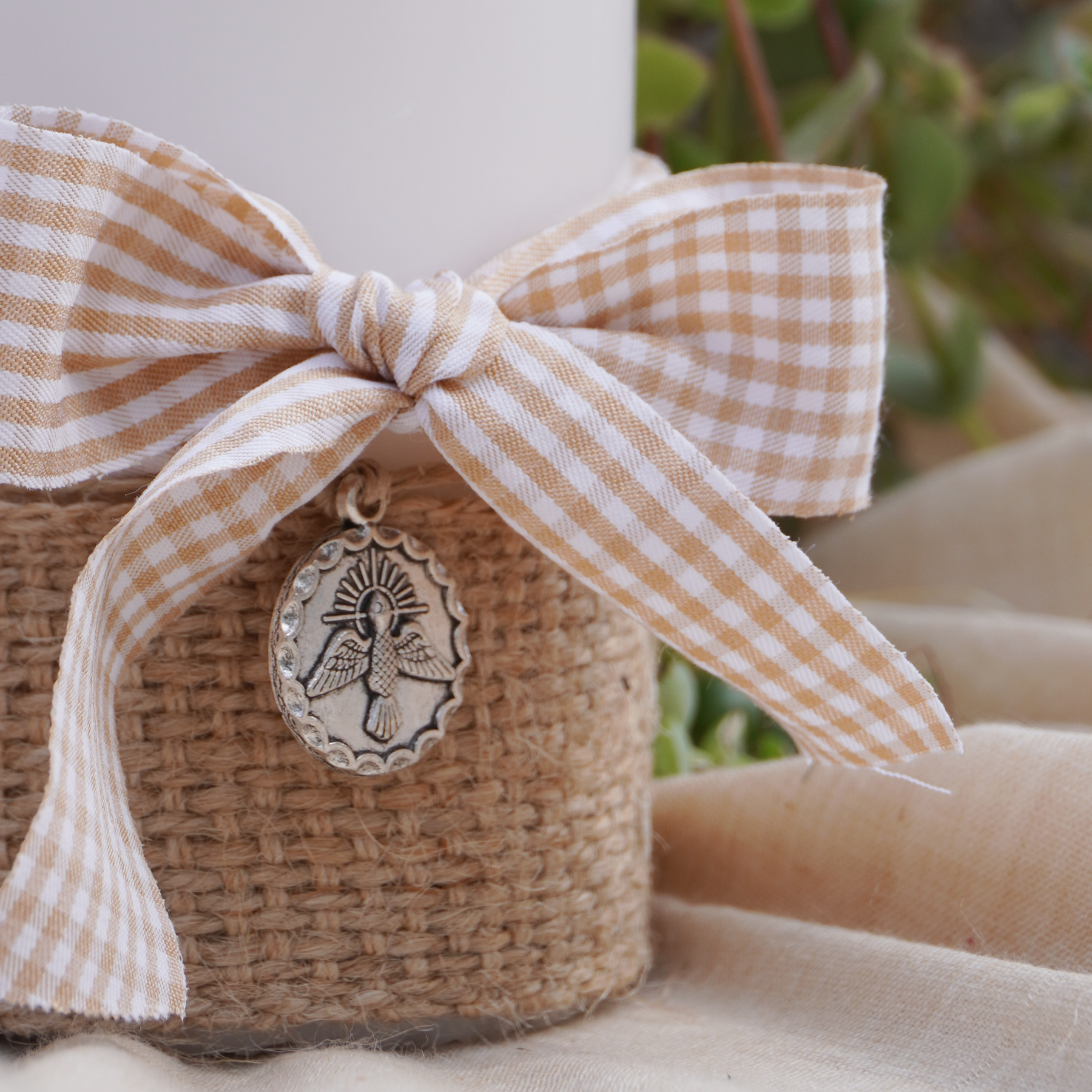 Cirio bautismal con un delicado detalle en cinta arpillera y cinta, con medalla del espíritu santo.