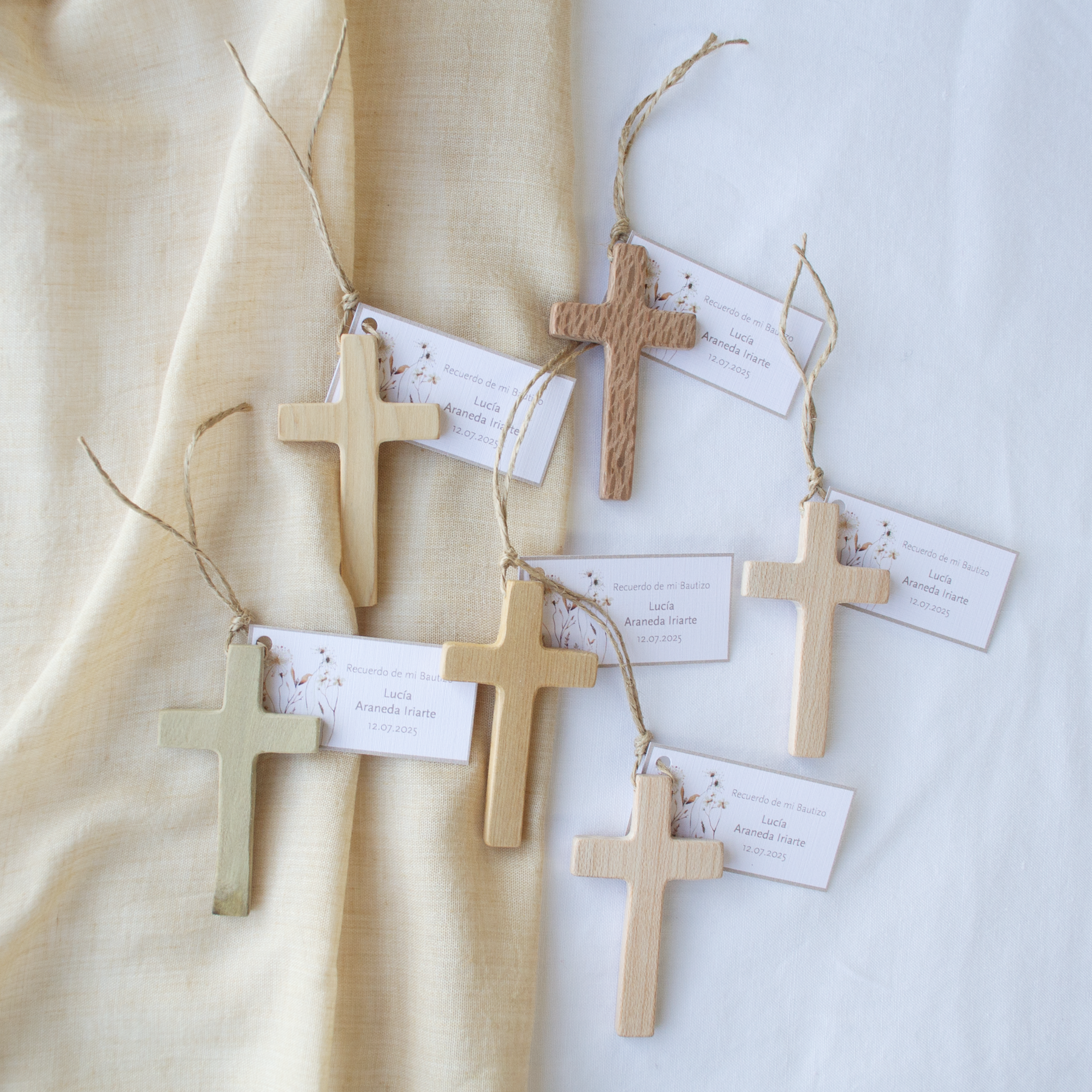 Miden aproximadamente 7 x 4 cm y vienen con un cordel sencillo y una tarjeta personalizada con el tipo de ceremonia, nombre y fecha. Son cruces pequeñas, pensadas para llevar en la mano durante la oración, o simplemente tener cerca como un símbolo de fe y acompañamiento espiritual.