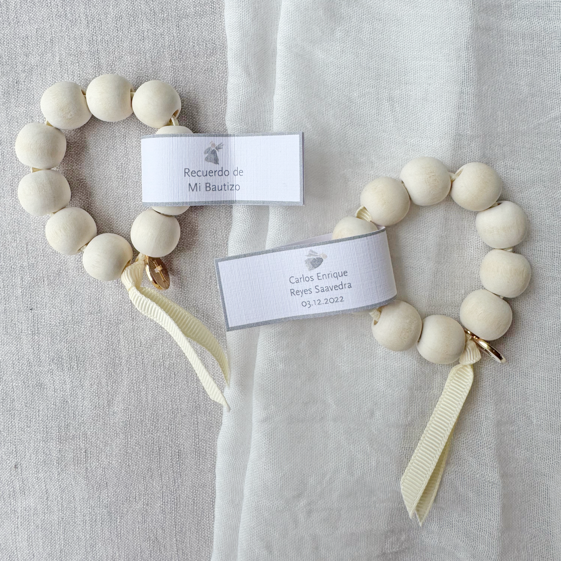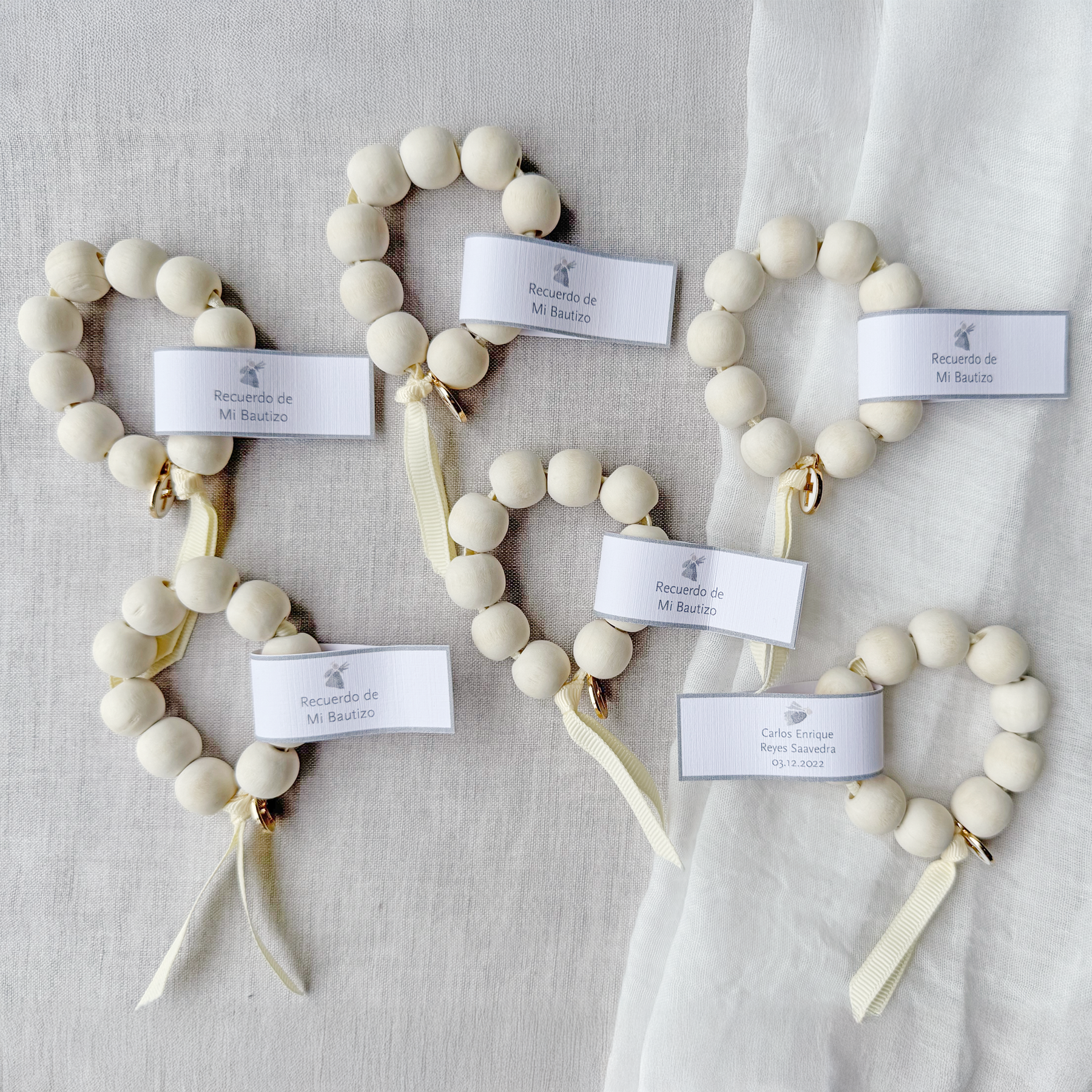 Cada uno de estos denarios de mandera viene con una tarjeta personalizada que indica qué tipo de celebración es (bautizo, primera comunión, etc), la fecha del evento y el nombre del celebrado.