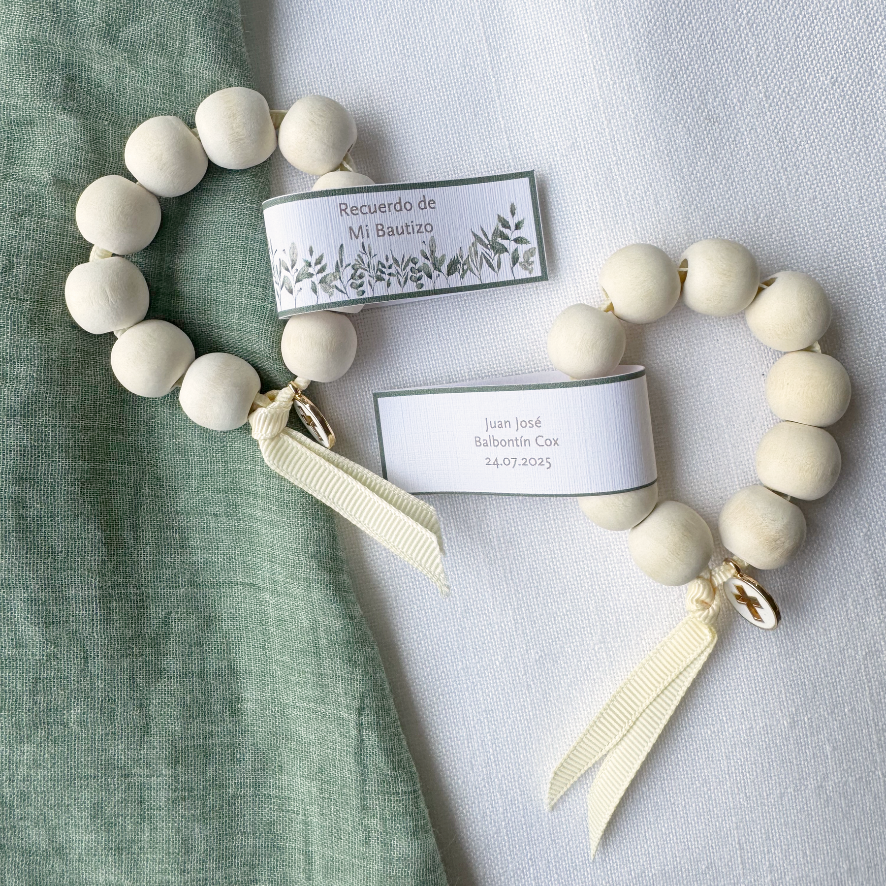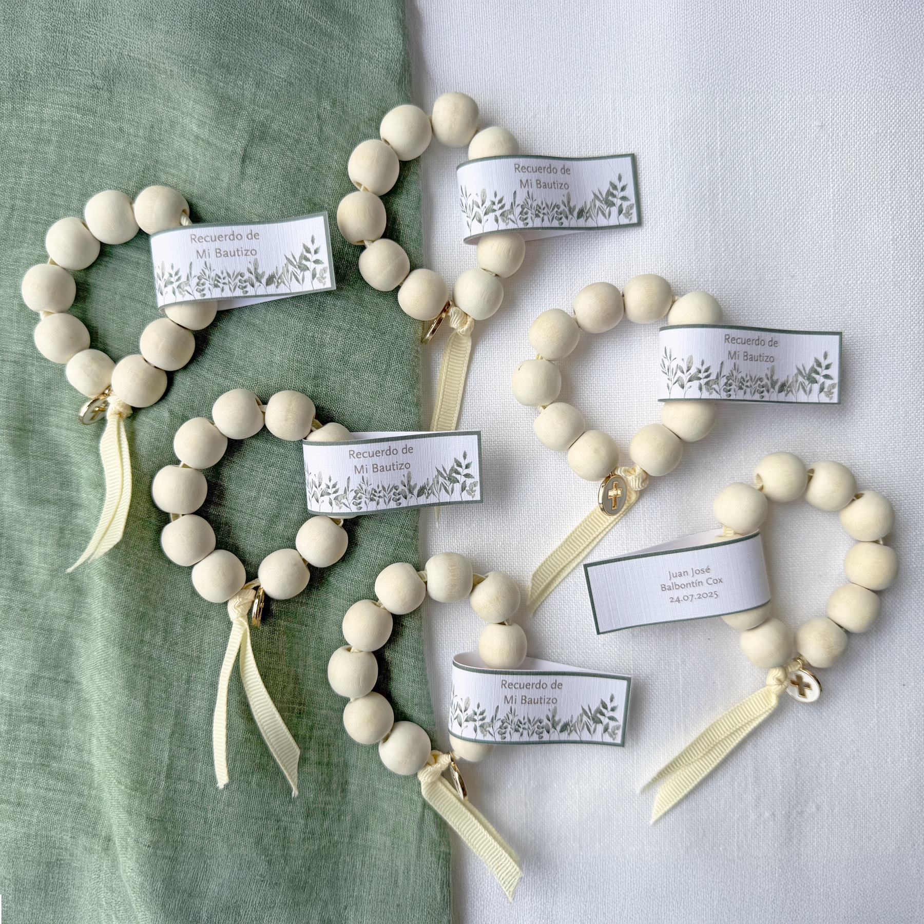 Cada uno de estos denarios de mandera viene con una tarjeta personalizada que indica qué tipo de celebración es (bautizo, primera comunión, etc), la fecha del evento y el nombre del celebrado.