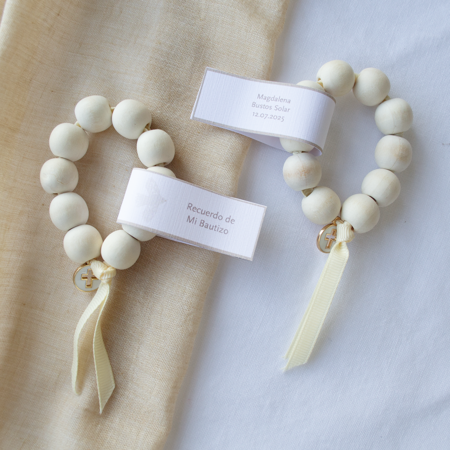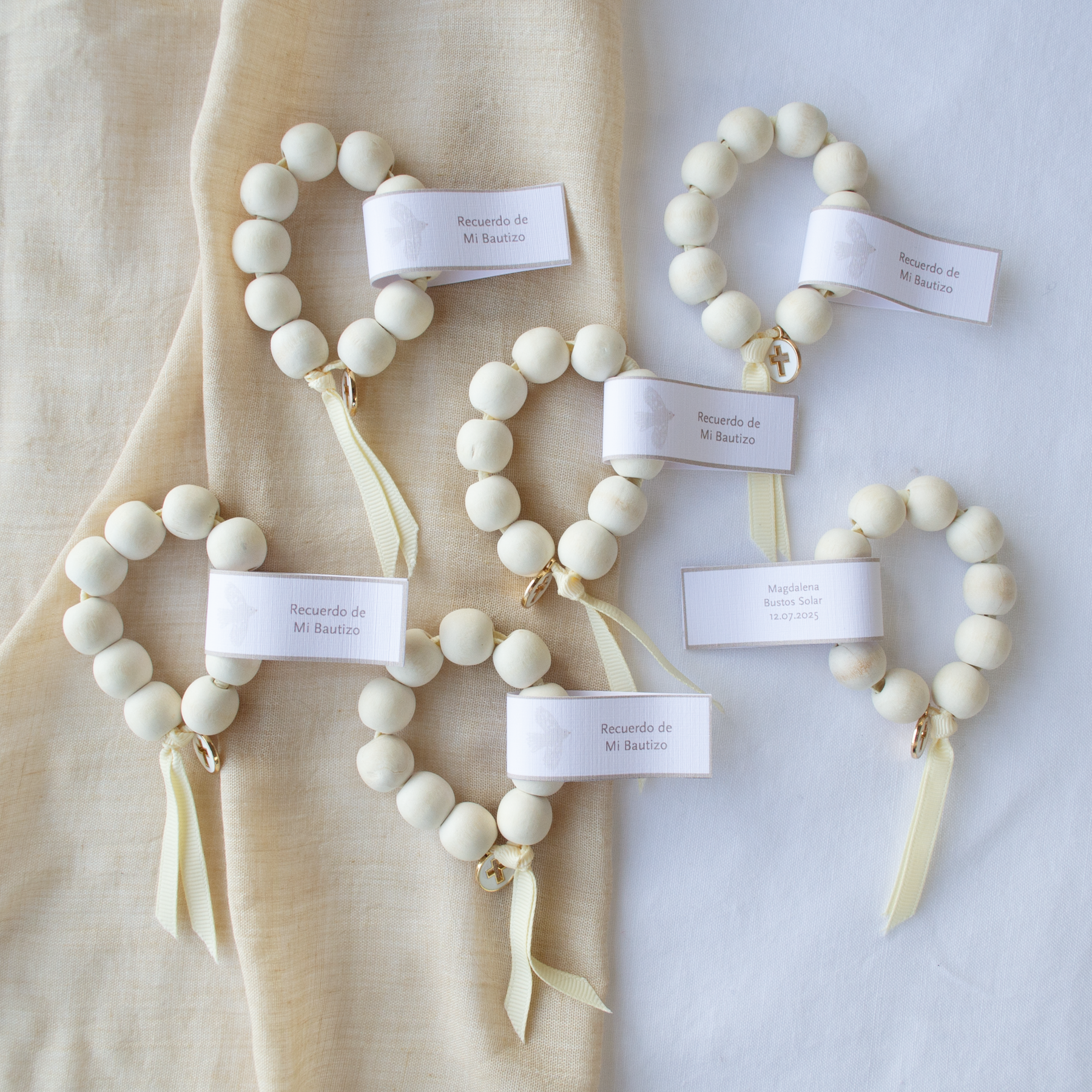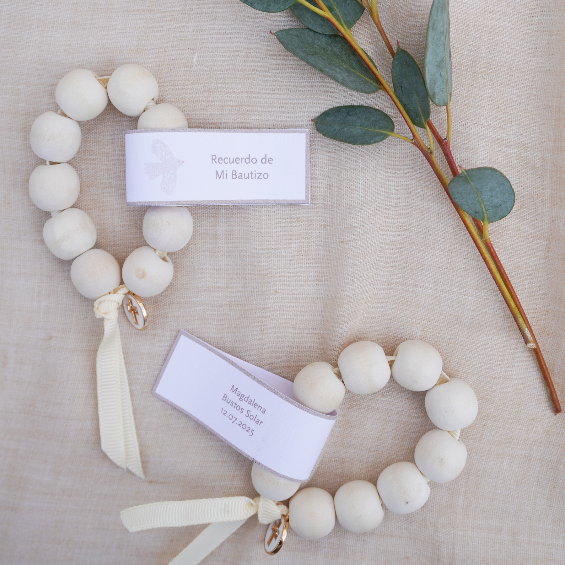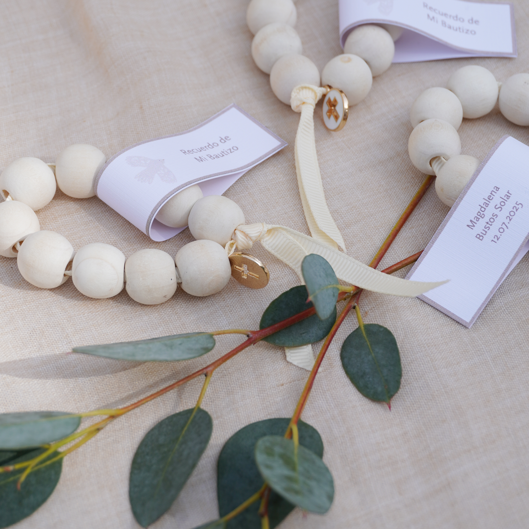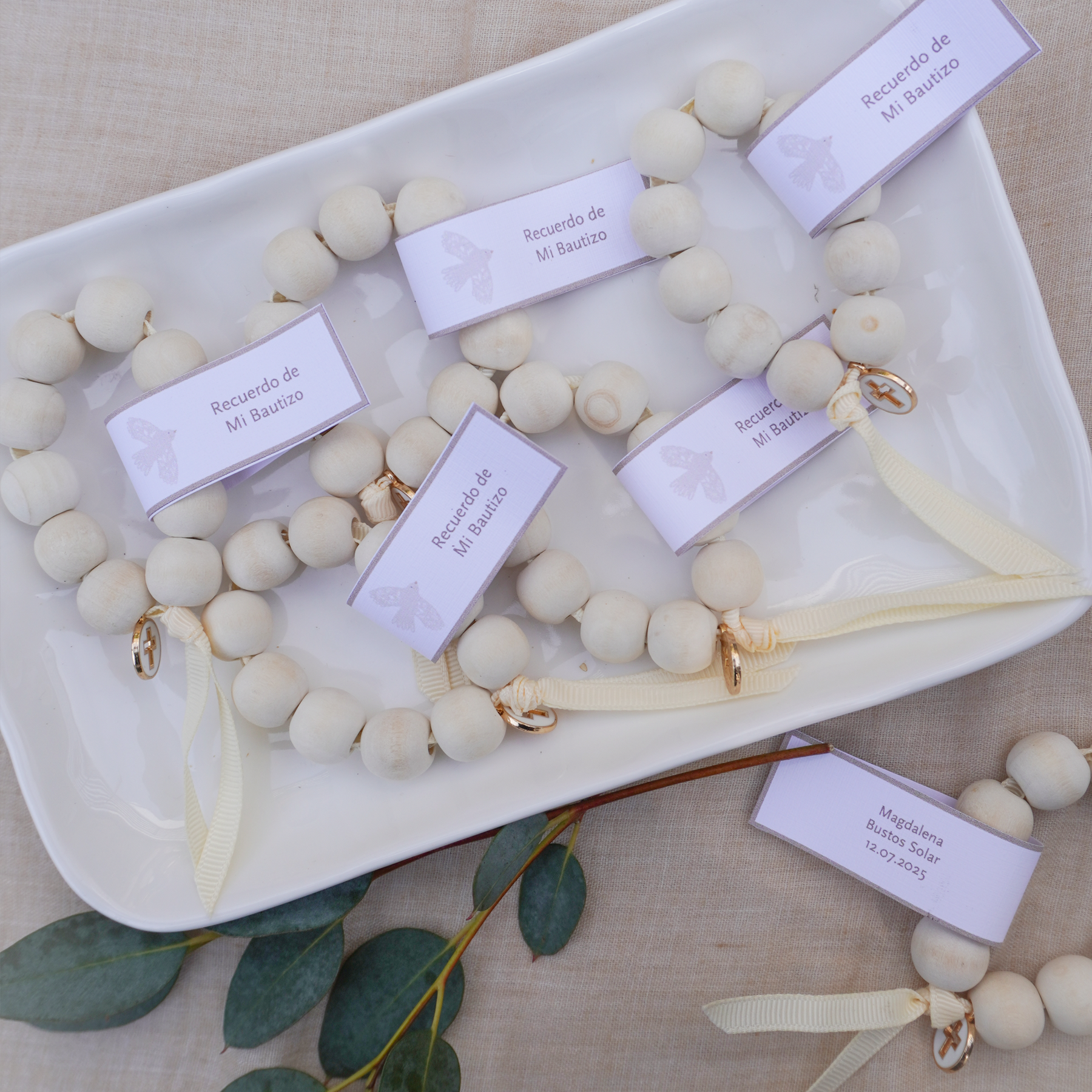 Cada uno de estos denarios de mandera viene con una tarjeta personalizada que indica qué tipo de celebración es (bautizo, primera comunión, etc), la fecha del evento y el nombre del celebrado.