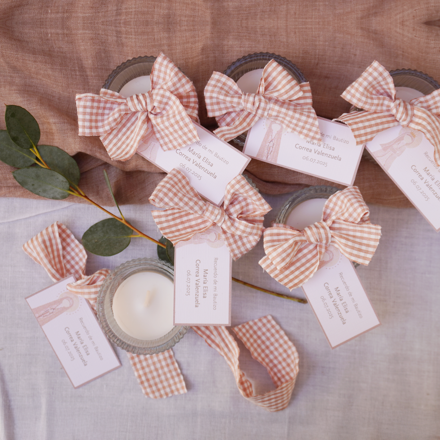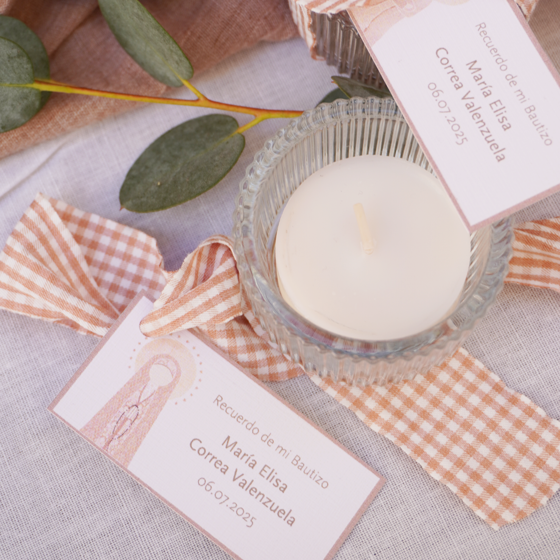 Este pack de velas pequeñas tipo tealight es un detalle elegante, práctico y lleno de significado para tus celebraciones religiosas. Incluye 6 velas de cera natural, cada una en su propio portavela de vidrio, decorada con delicadas cintas vichy en distintos colores y acompañadas de una tarjeta personalizada con el nombre, fecha o mensaje que quieras.
