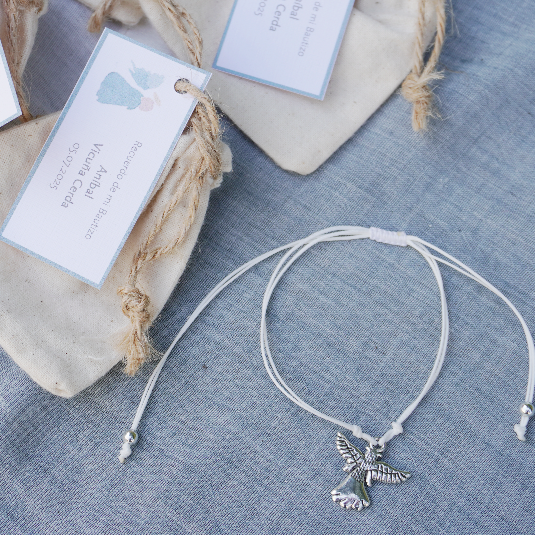Cada una de estas pulseras ajustables vienen en su bolsita de algodón con una tarjeta personalizada que indica qué tipo de celebración es (bautizo, primera comunión, etc), la fecha del evento y el nombre del celebrado.