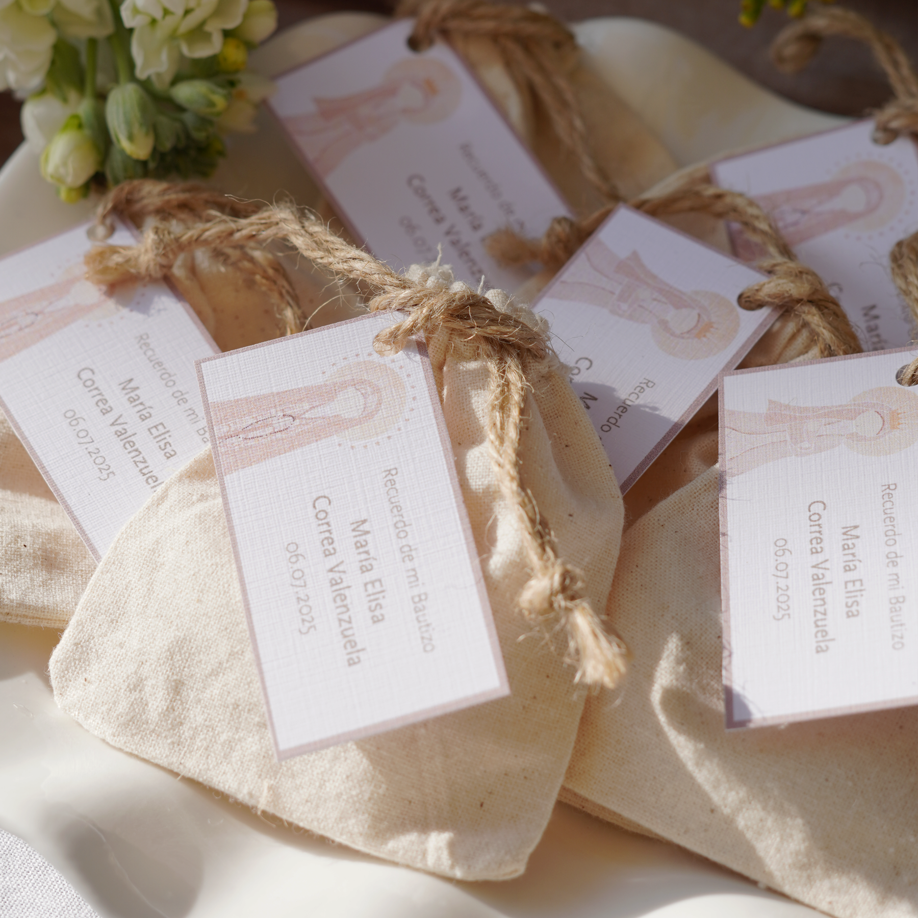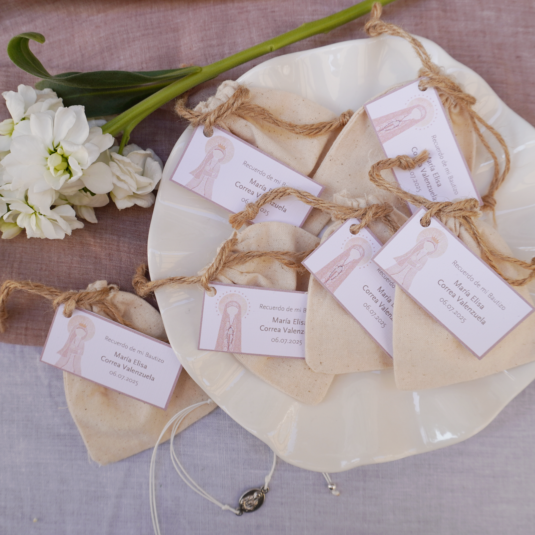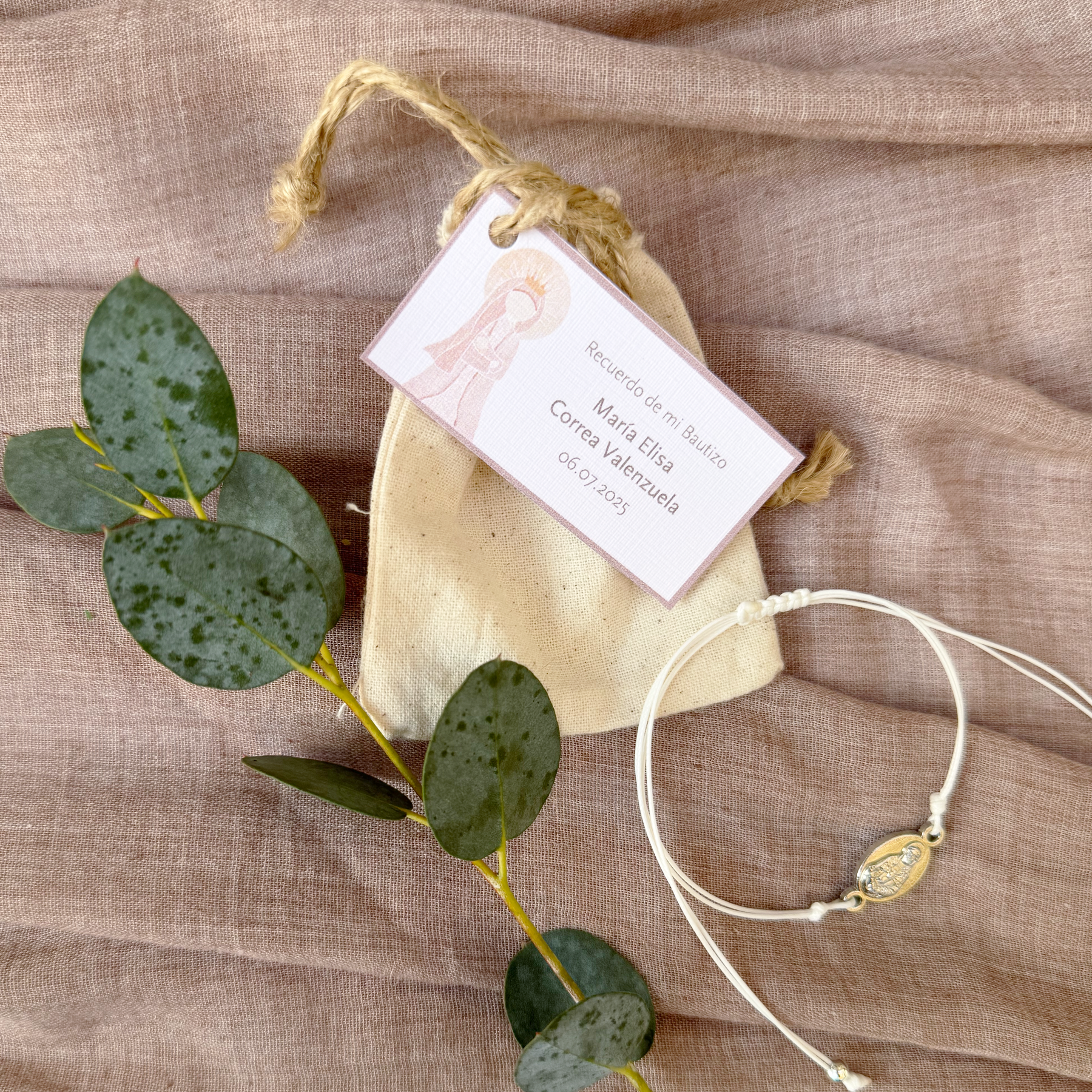 Cada una de estas pulseras ajustables vienen en su bolsita de algodón con una tarjeta personalizada que indica qué tipo de celebración es (bautizo, primera comunión, etc), la fecha del evento y el nombre del celebrado.