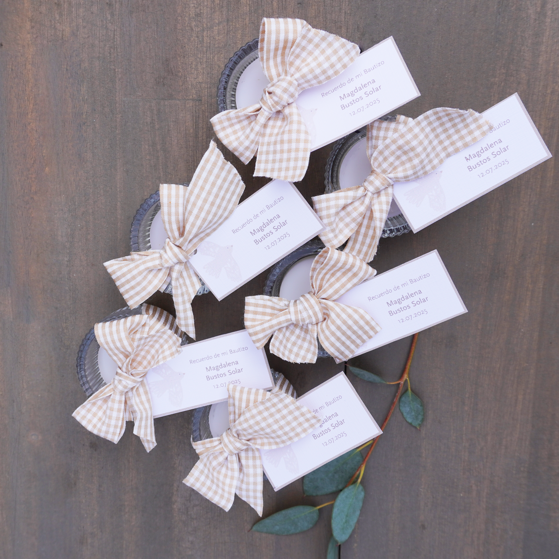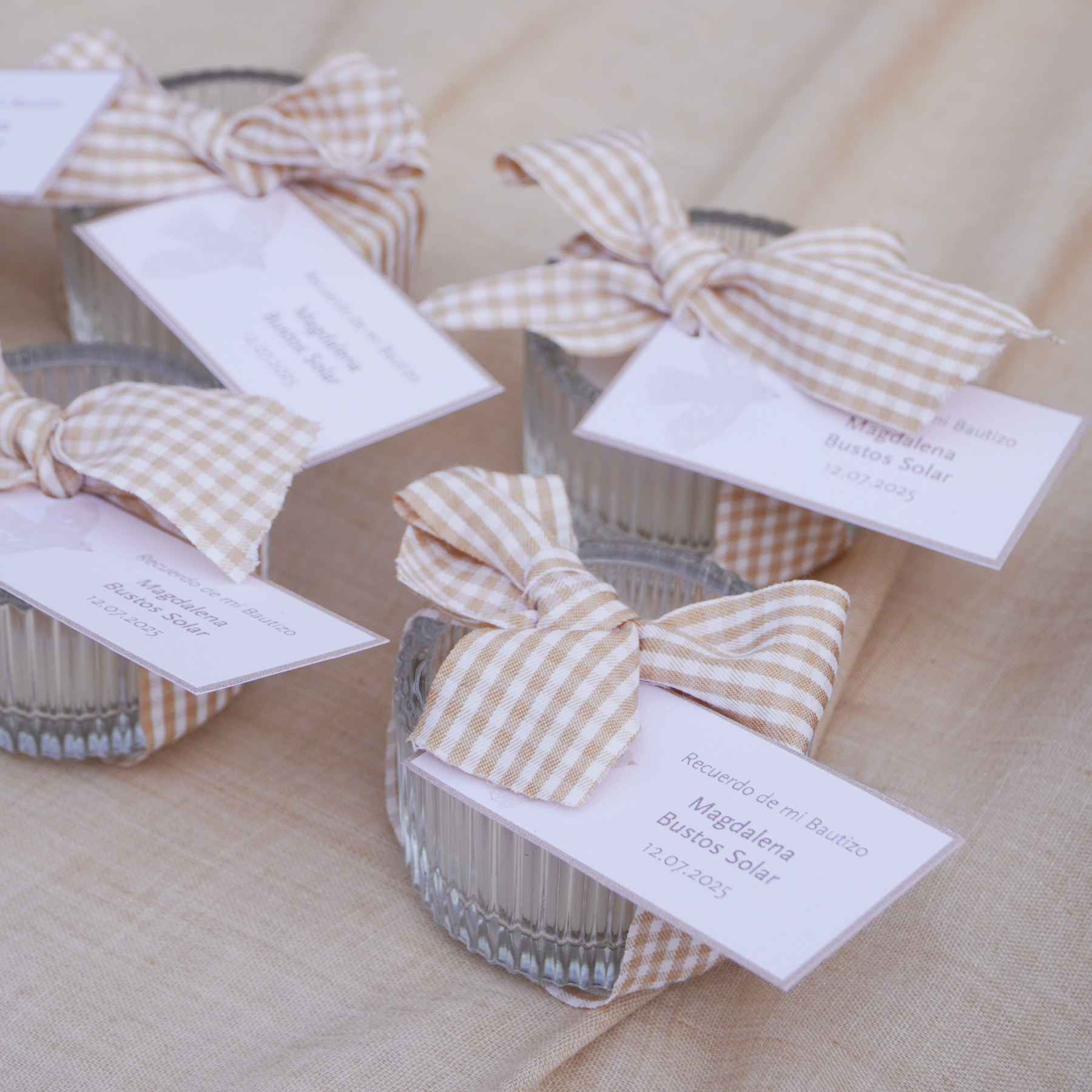 Este pack de velas pequeñas tipo tealight es un detalle elegante, práctico y lleno de significado para tus celebraciones religiosas. Incluye 6 velas de cera natural, cada una en su propio portavela de vidrio, decorada con delicadas cintas vichy en distintos colores y acompañadas de una tarjeta personalizada con el nombre, fecha o mensaje que quieras.
