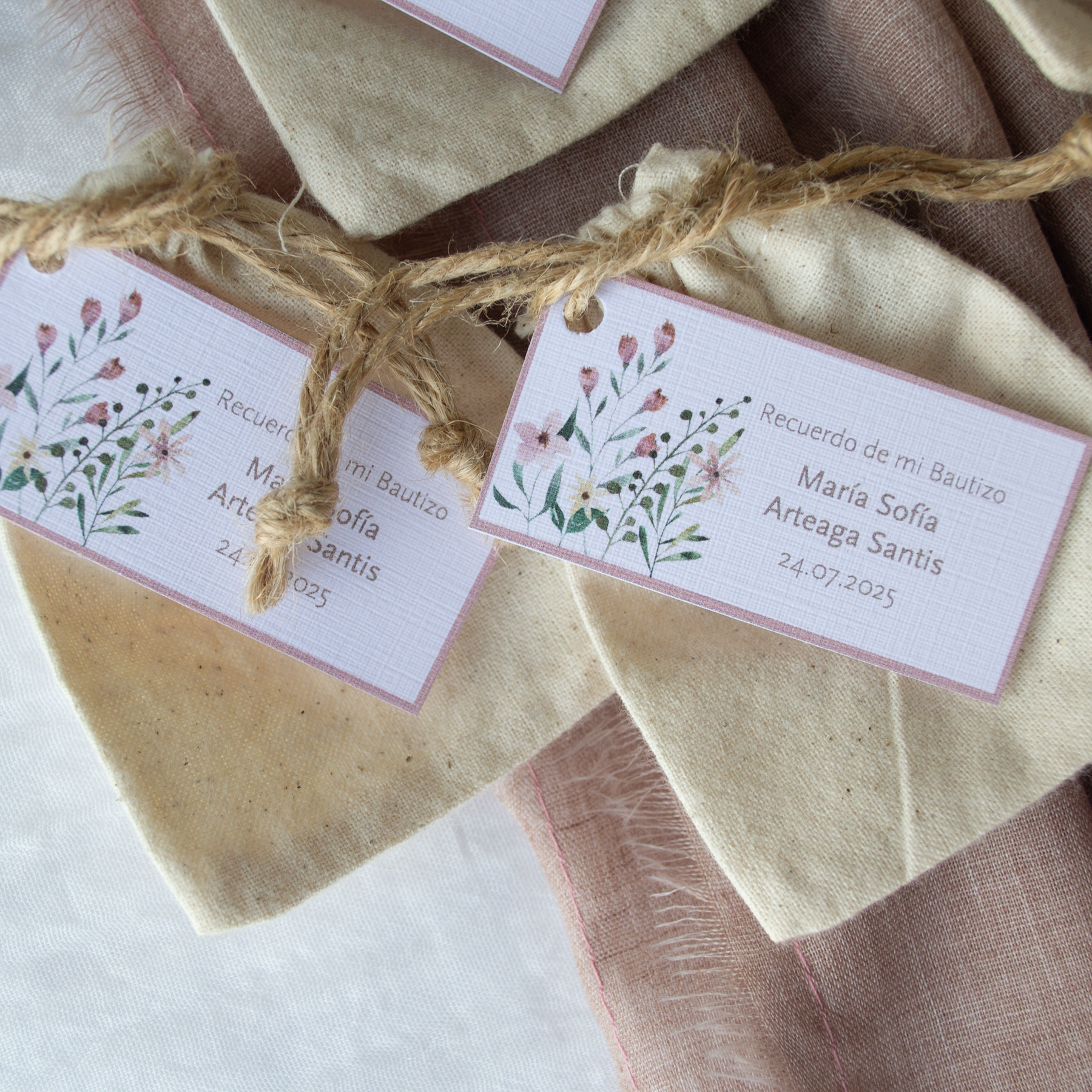 Cada una de estas pulseras ajustables vienen en su bolsita de algodón con una tarjeta personalizada que indica qué tipo de celebración es (bautizo, primera comunión, etc), la fecha del evento y el nombre del celebrado.