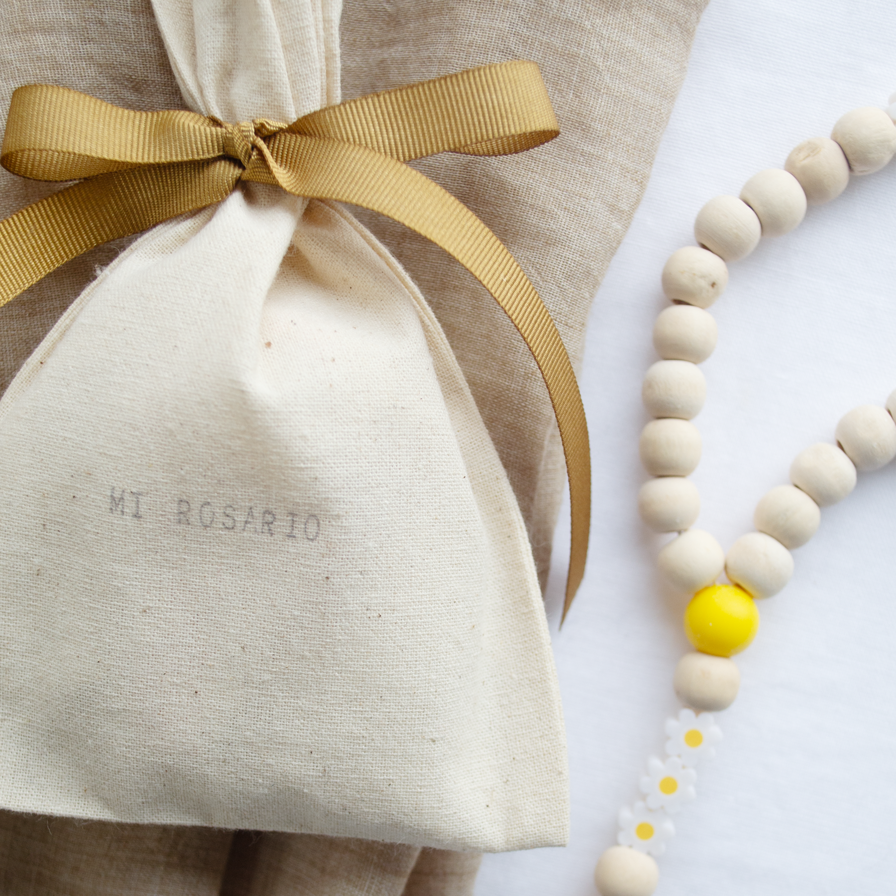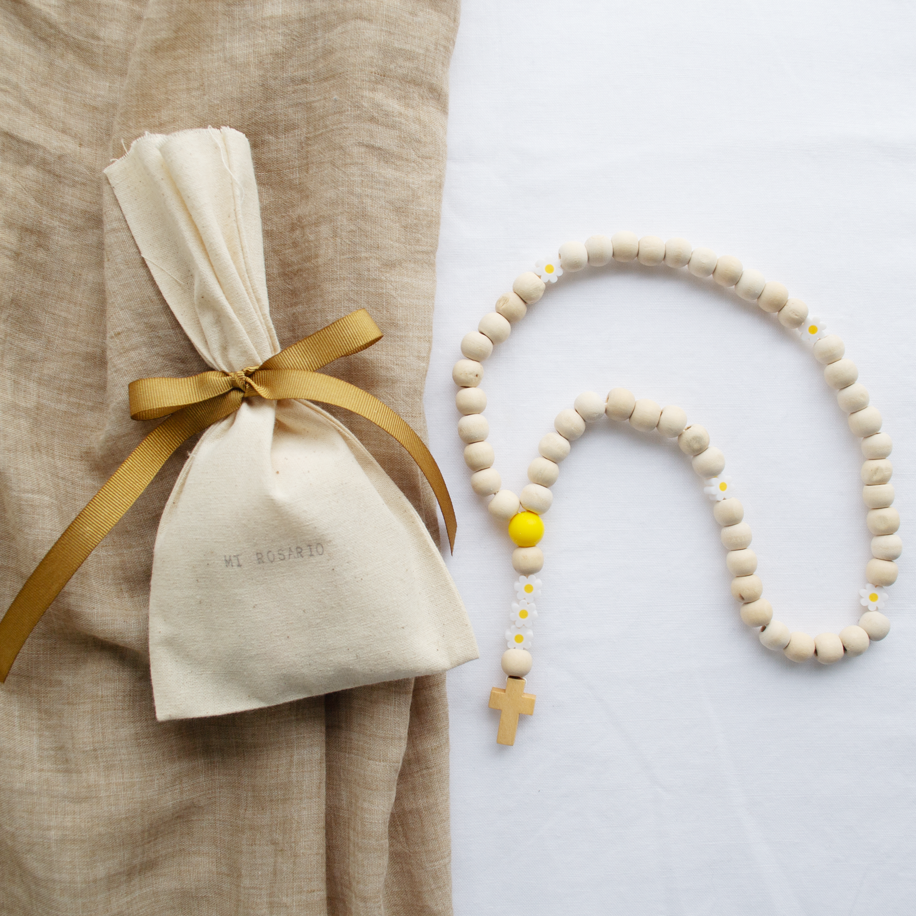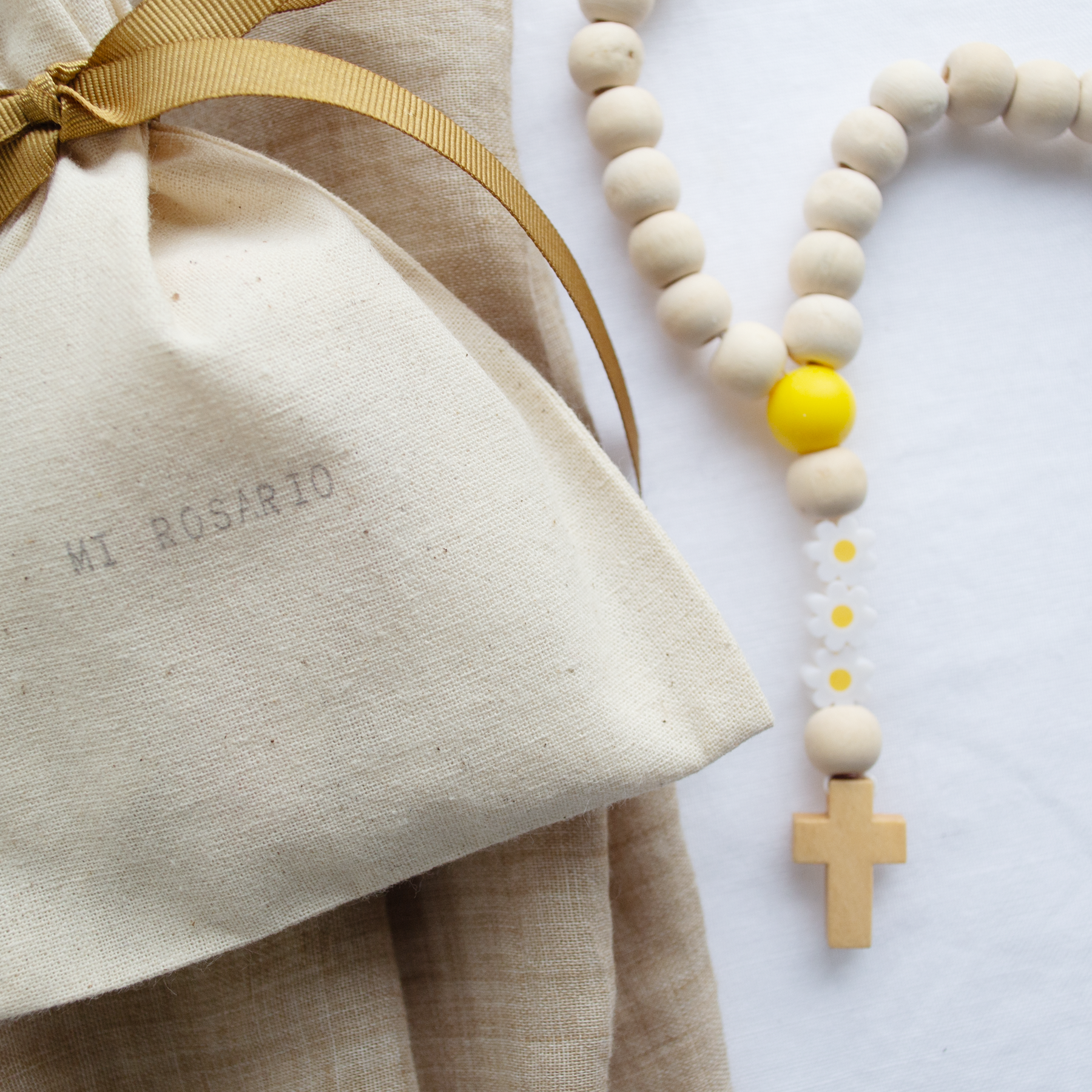 Incluye: Rosario de madera con toques amarillos y margaritas + bolsita de algodón estampada "Mi Rosario"