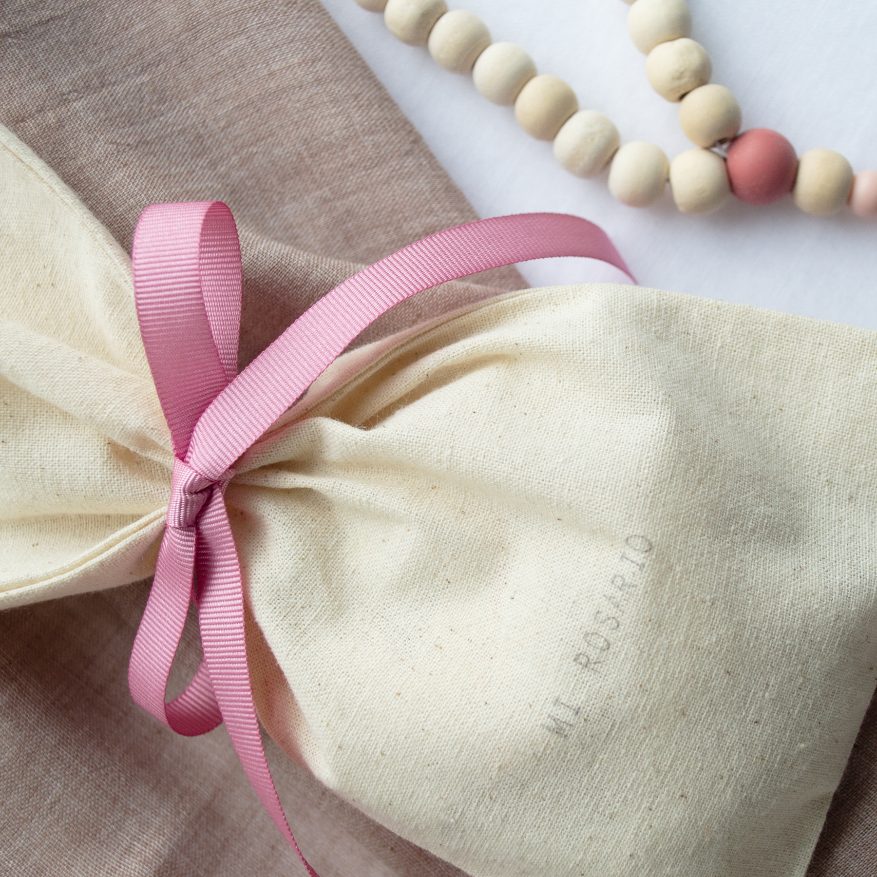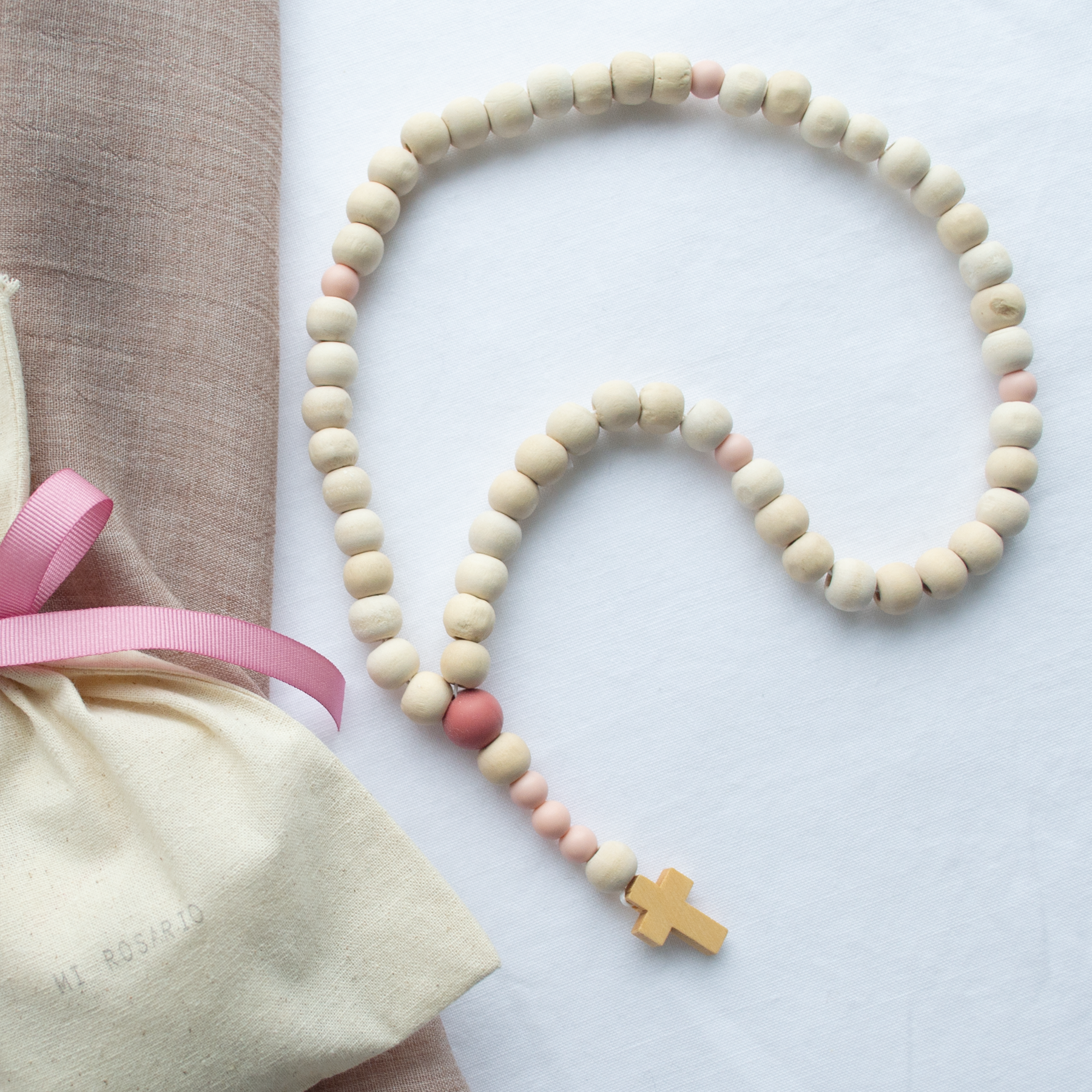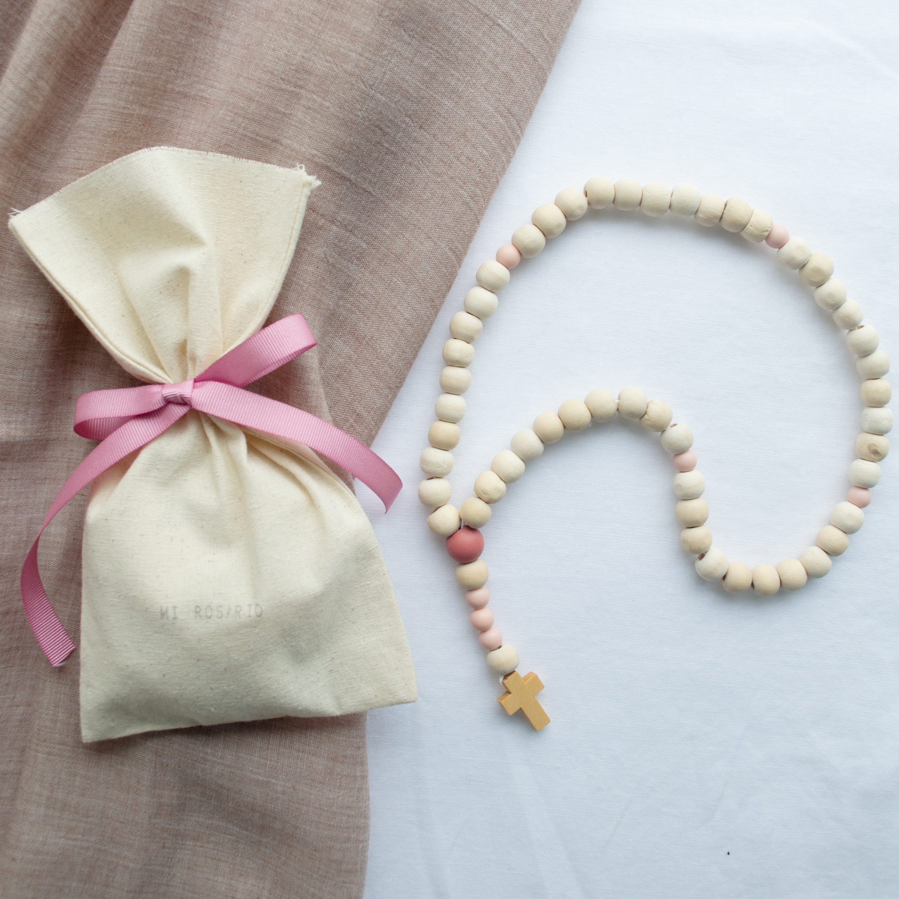 Incluye: Rosario de madera con toques en tonos de rosa + bolsita de algodón estampada "Mi Rosario"